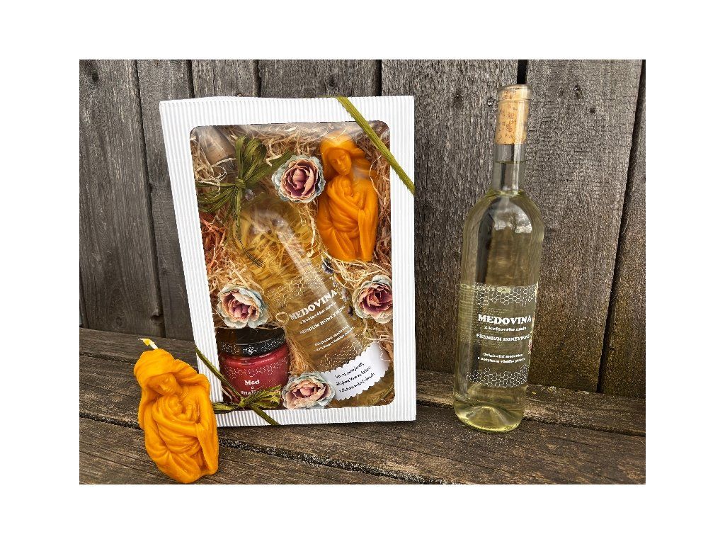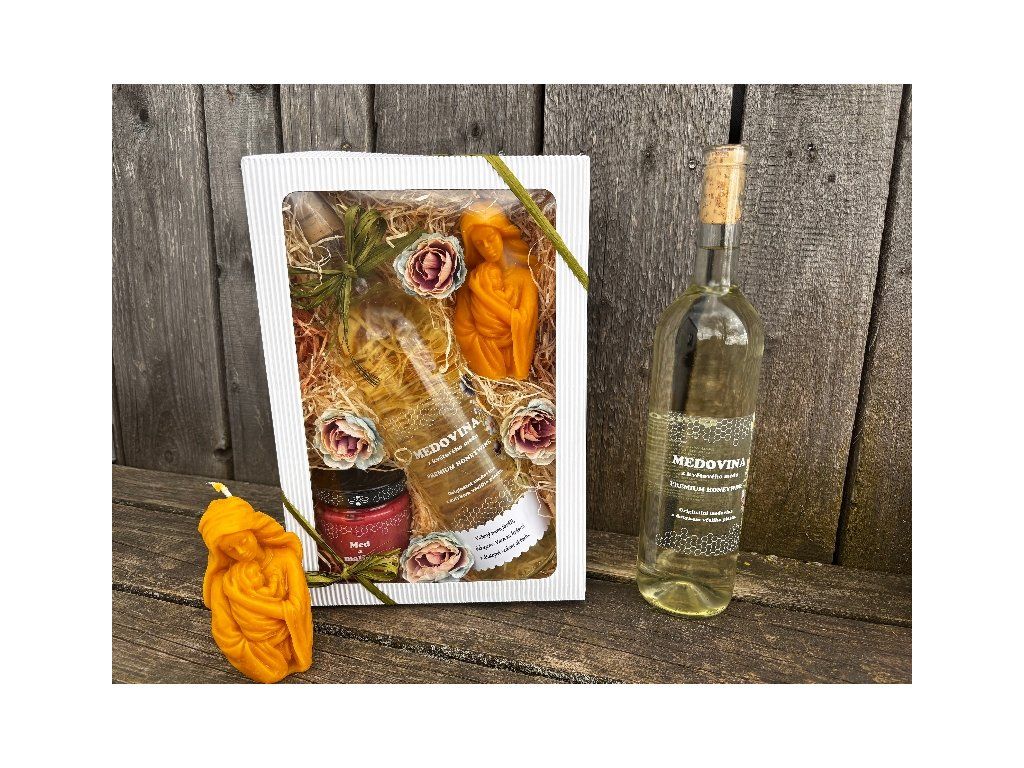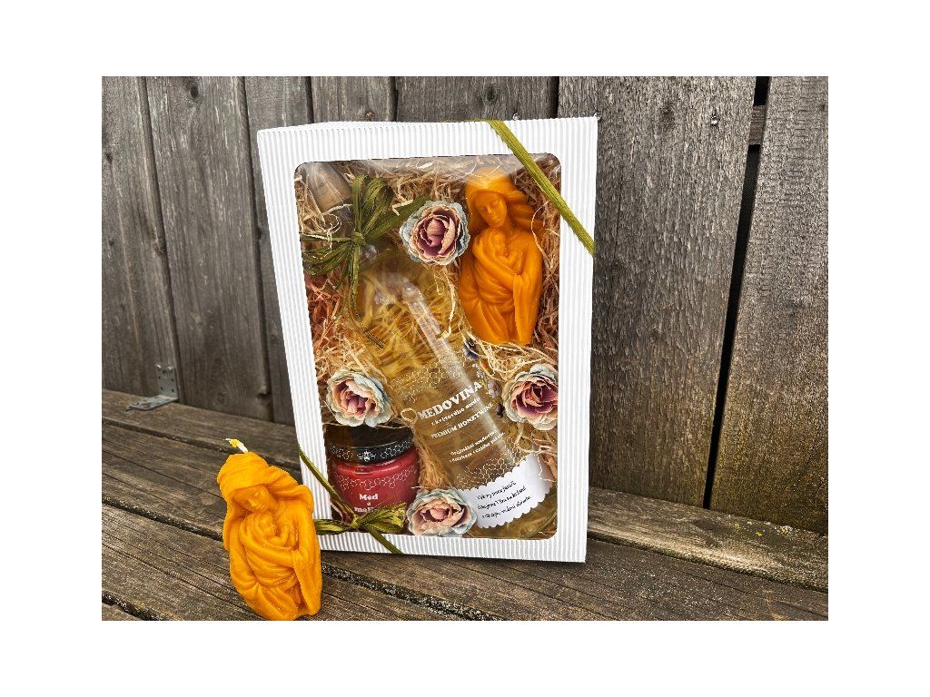 Kvalitní kartonová krabice o velikosti 31x21x7cm obsahuje 250g květového pastovaného medu s malinami + 0,7l lahodné medoviny z květového medu vyráběné za studena + nádhernou svíčku z včelího vosku zobrazující Marii s děťátkem. Dárek je navíc přizdoben textilními květy. Překrásný dárek, kterým rozhodně potěšíte.