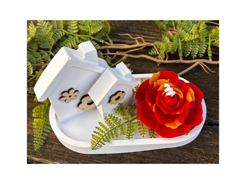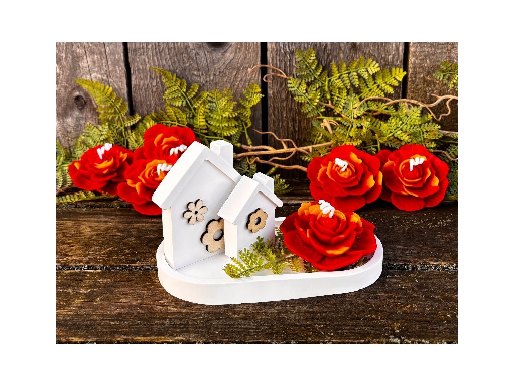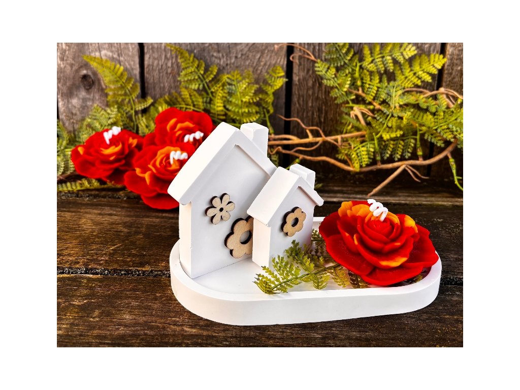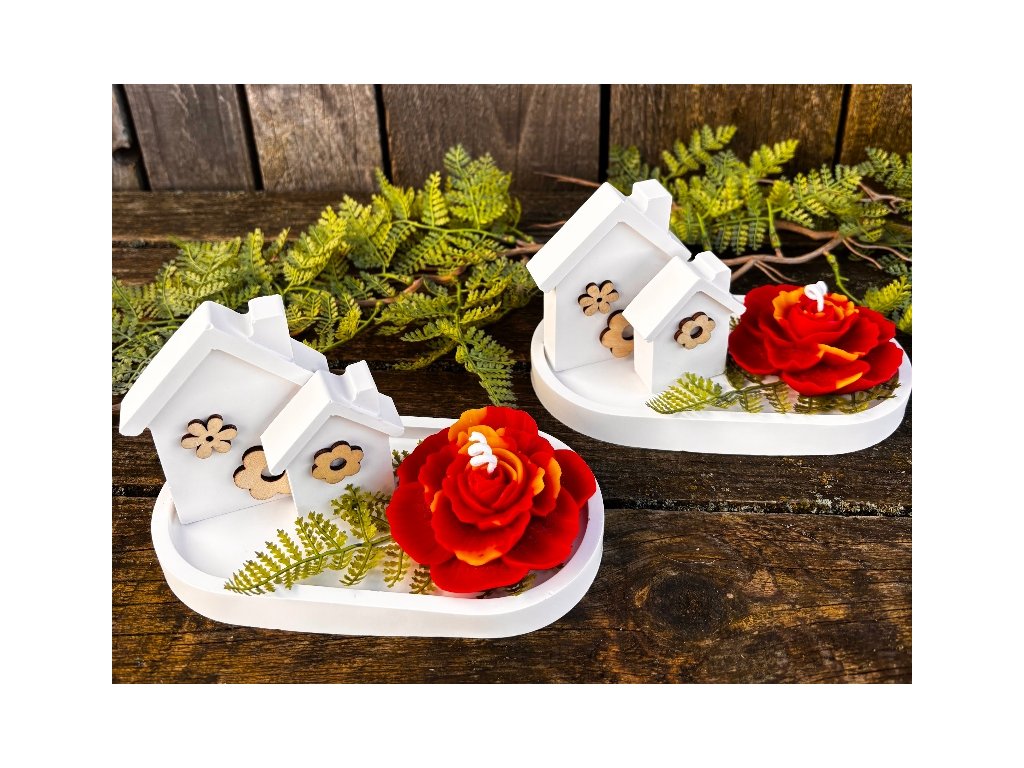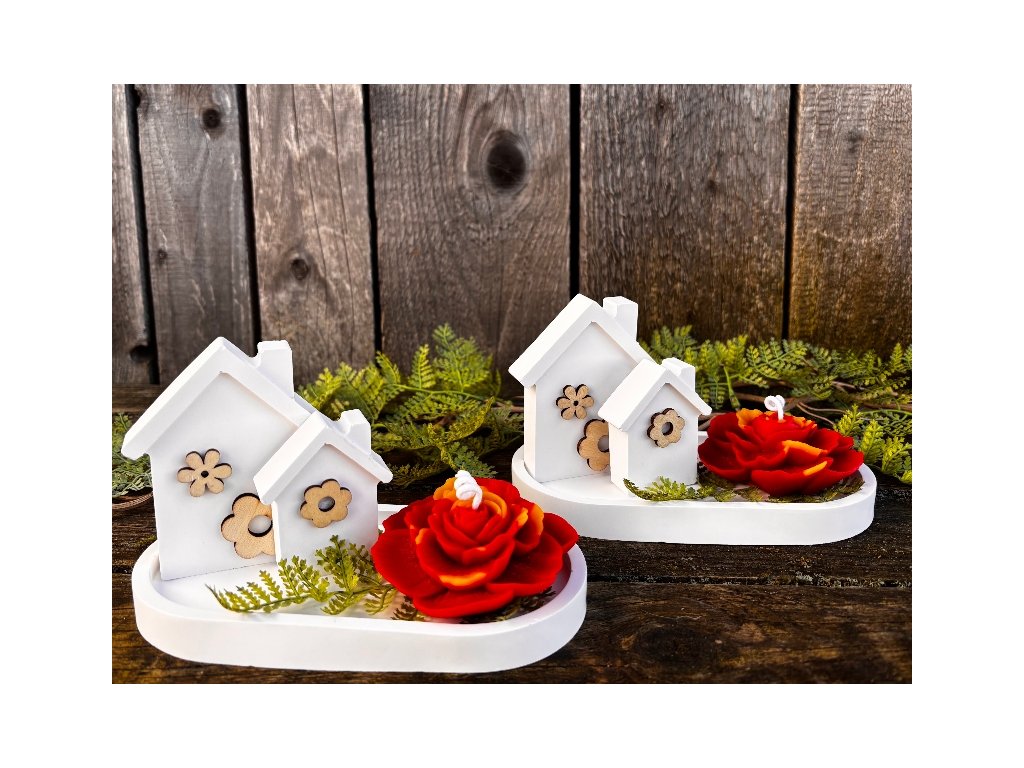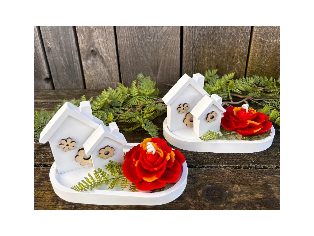 Krásný keramický jarní nebo i letní svícen kompletně ručně odlitý v naší dílně. Abychom byli samostatní i v nádobách a dekoracích, které používáme pro naše svíčky, rozhodli jsme se, že si je budeme odlévat sami. Tento svícen se skládá z tácku, na kterém jsou umístěny dva různě vysoké domečky z lité keramiky přizdobené dřevěnými květinami a velmi krásné svíčky karafiátu. Tato svíčka je opravdu věrnou kopií karafiátu s krásnými detaily. Je odlita z pravého včelího vosku dobarveného do červena s kombinací přírodního nebarveného vosku. Celkově tento komplet vypadá naprosto dokonale, je to opravdu skvělá dekorace. Můžete jej využít jako naprosto originální dárek a určitě s ním budete mít úspěch, ale radost by určitě udělal i vám!