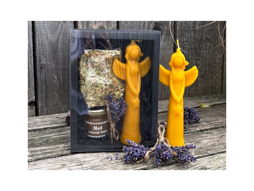 Krásný dárek v luxusní černé krabici, ve které se medové produkty opravdu skvěle vyjímají. Překrásná svíčka odlitá z pravého včelího vosku je doplněna 50g květového lesního medu a 20g sušeného lipového květu. Třešničkou na dortu je pak dekorace v podobě snítky sušené levandule. Obdarovaný si tak může uvařit lahodný lipový čaj, osladit si ho skvělým medem z Vysočiny a zapálit si u jeho popíjení medovou svíčku. Nevšední a skutečně velmi hezký dárek se kterým nešlápnete vedle!