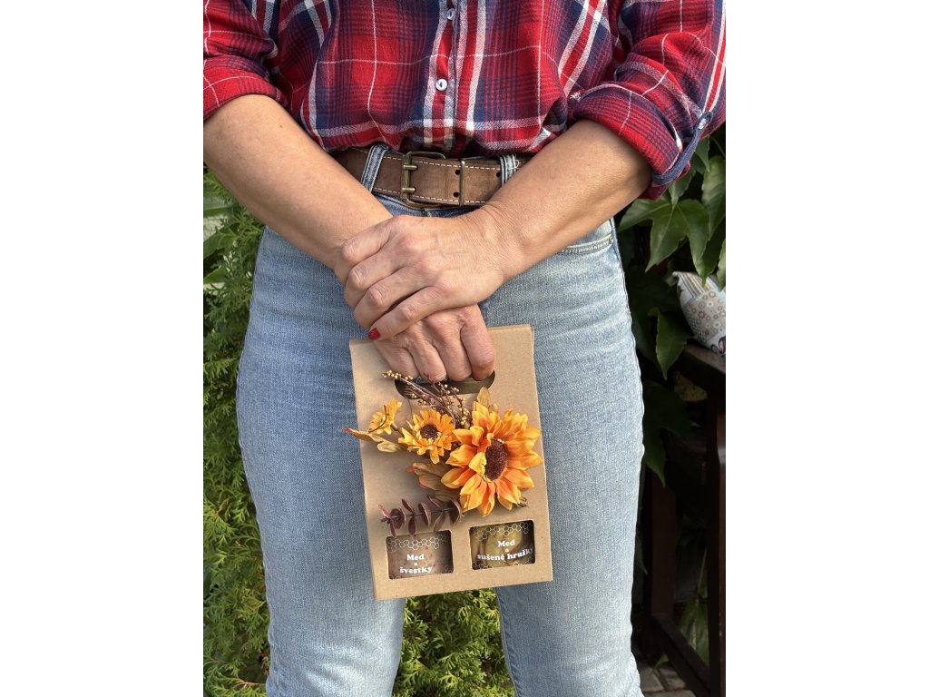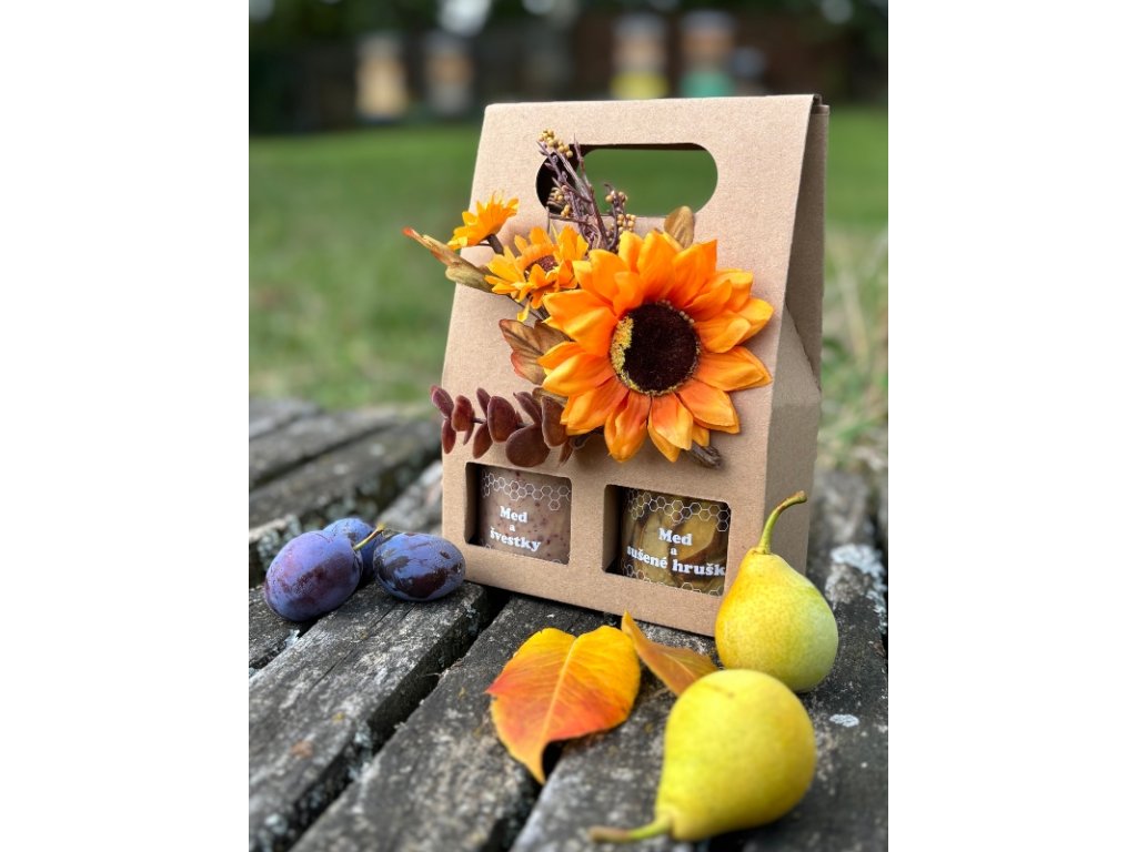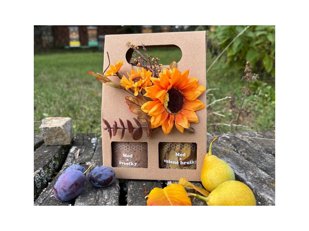 Překrásný medový dárek, ke kterému už nemusíte kupovat květiny, protože kvalitní kartonová krabička je přizdobena slunečnicovou dekorací. V krabičce jsou pak uloženy medové pochoutky výborné chuti i vůně. 250g květového medu se sušenými hruškami. Sušené hrušky jsou báječnou pochoutkou samy o sobě a když se ještě navíc naloží do medu vznikne kombinace, která prostě nemá chybu. Druhým produktem je 250g květového pastovaného medu s lyofilizovanými švestkami. Další skvělá pochoutka, kterou můžete sladit prakticky cokoliv, nebo ji mlsat místo čokolády. Skvělá kombinace typicky českého ovoce v medu udělá radost každému a v takto krásně přizdobené krabici bude ta radost dvojnásobná!
