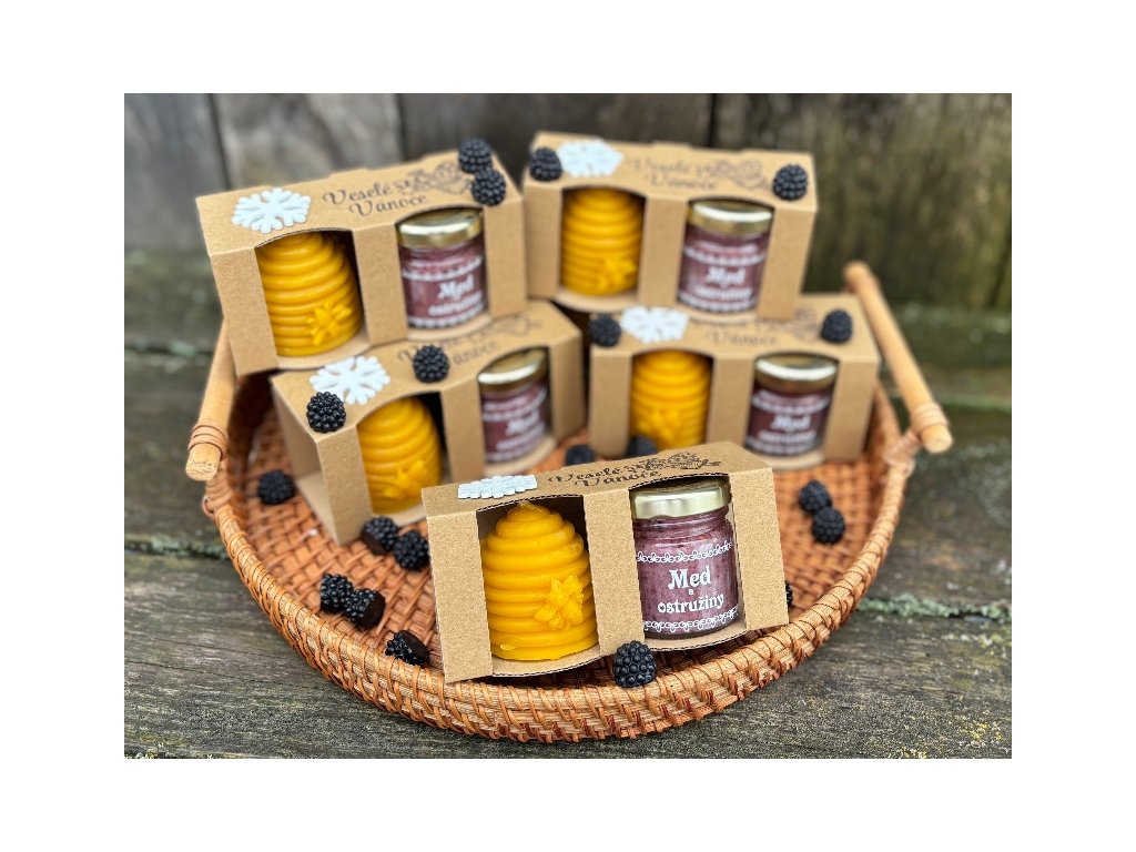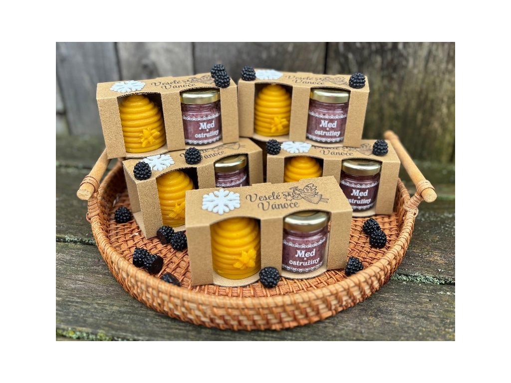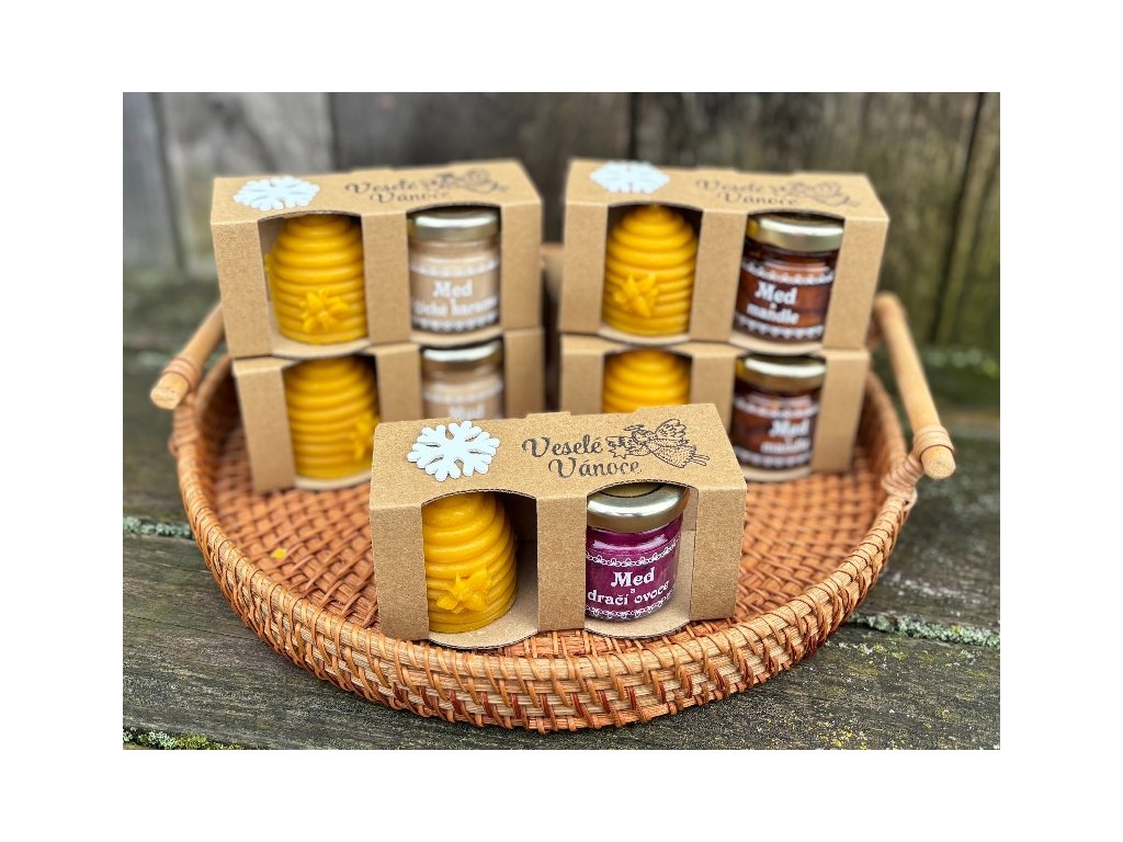 Malý medový vánoční dárek, pozornost....prostě dárek do ruky, kterým uděláte radost kolegům, kamarádkám, nebo vlastně každému, komu budete chtít vykouzlit úsměv...dárek, který se vždycky hodí. Prodáváno ve více variantách. Obsahem je vždy 50g medu a krásná svíčka odlitá z pravého včelího vosku ve tvaru včelího úlku. Krabička je opatřena vánočním textem a dřevěnou hvězdičkovou dekorací. Milá a originální pozornost!