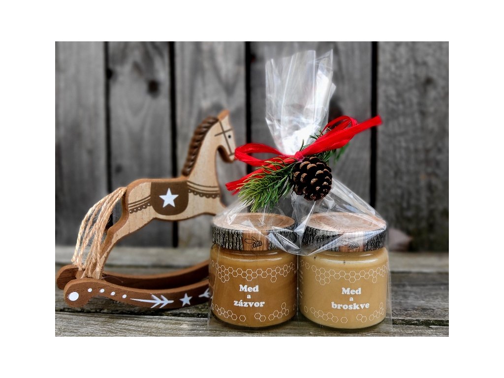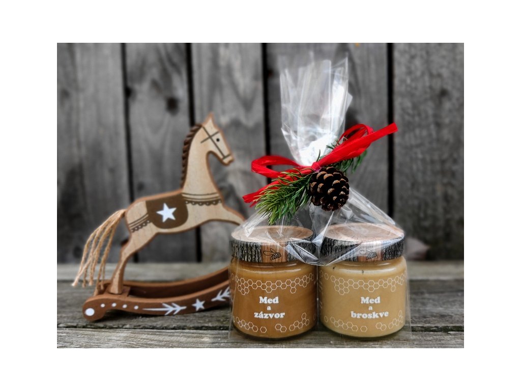 Květový pastovaný med se zázvorem a květový pastovaný med s broskvemi je skvělou kombinací. Oba tyto medy o obsahu 250g jsou vhodné ke slazení čajů, broskvový med se pak navíc hodí i ke slazení kaší, jogurtů nebo tvarohů. Také je výborný na pečivo, palačinky nebo lívance. Uloženo v celofánovém sáčku, přizdobeno smrkovou snítkou a borovou šiškou. Moc hezký a zdravý dárek pro vaše blízké.