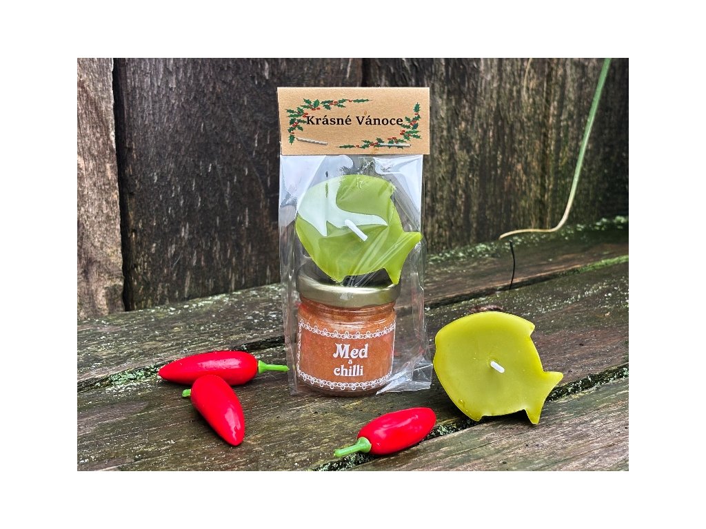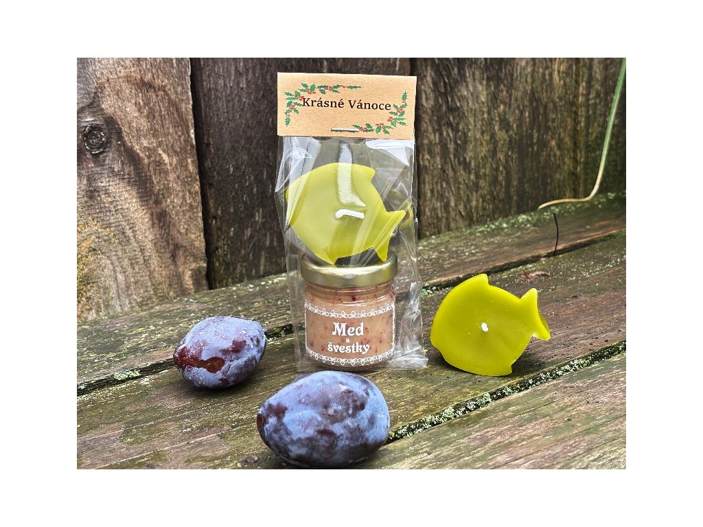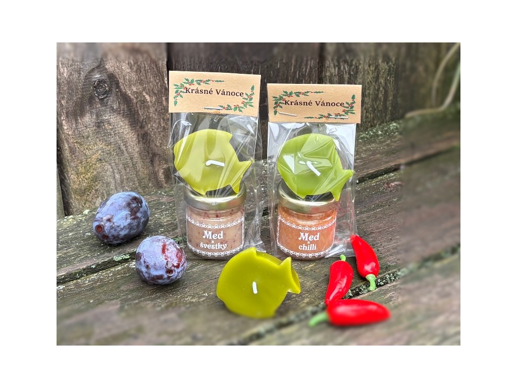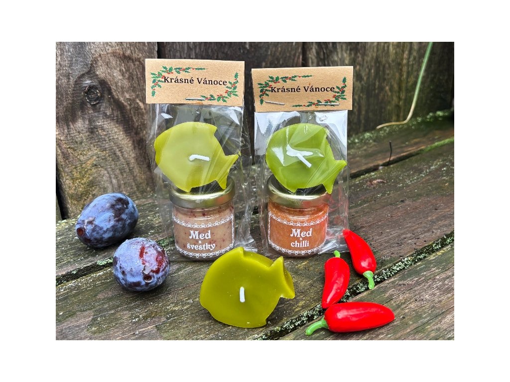 Malý, originální a zdravý medový vánoční dáreček . Květový pastovaný med se švestkami nebo s chilli ( 50g )...záleží, kterou z variant si vyberete... + plovoucí svíčka z včelího vosku dobarveného na zeleno ve tvaru kapříka společně v celofánovém sáčku s ozdobným vánočním štítkem. Skvělý, krásný, zdravý a chutný dáreček, který může udělat radost vaším kolegům v práci, kamarádkám, kadeřnici, kosmetičce nebo třeba i sestřičce u vašeho pana doktora. Skvělá pozornost, takže doporučuji mít ji doma pro každý případ v záloze.