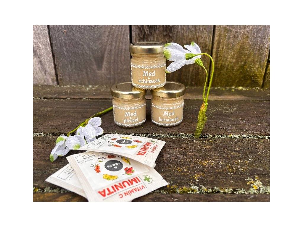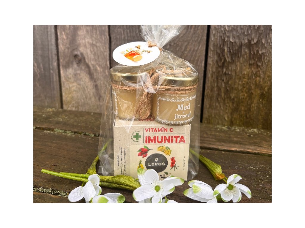 Nádherný dárek plný chutí, vůní a zdraví. Obdarovaný si může uvařit bylinný čaj a osladit ho některým z našich bylinkových medů. Tři druhy našich bylinkových medů - jitrocel + echinacea + heřmánek, vždy o obsahu 50g a naprosto skvělý bylinkový čaj Leros pro posílení imunity, to je sestava, která dělá z tohoto dárku naprosto dokonalou kombinaci pomoci pro naši imunitu. Vše zabaleno v celofánovém sáčku a přizdobeno medovou visačkou. Dárek je vhodný naprosto pro kohokoliv, ale radost s ním určitě můžete udělat i sobě.