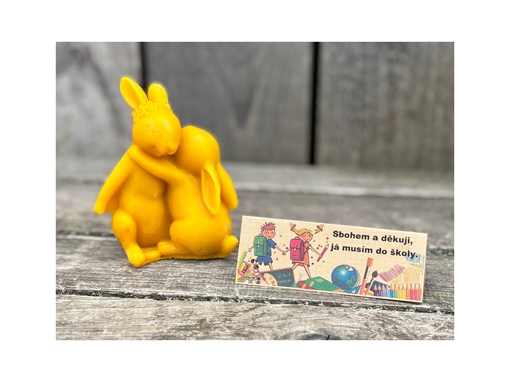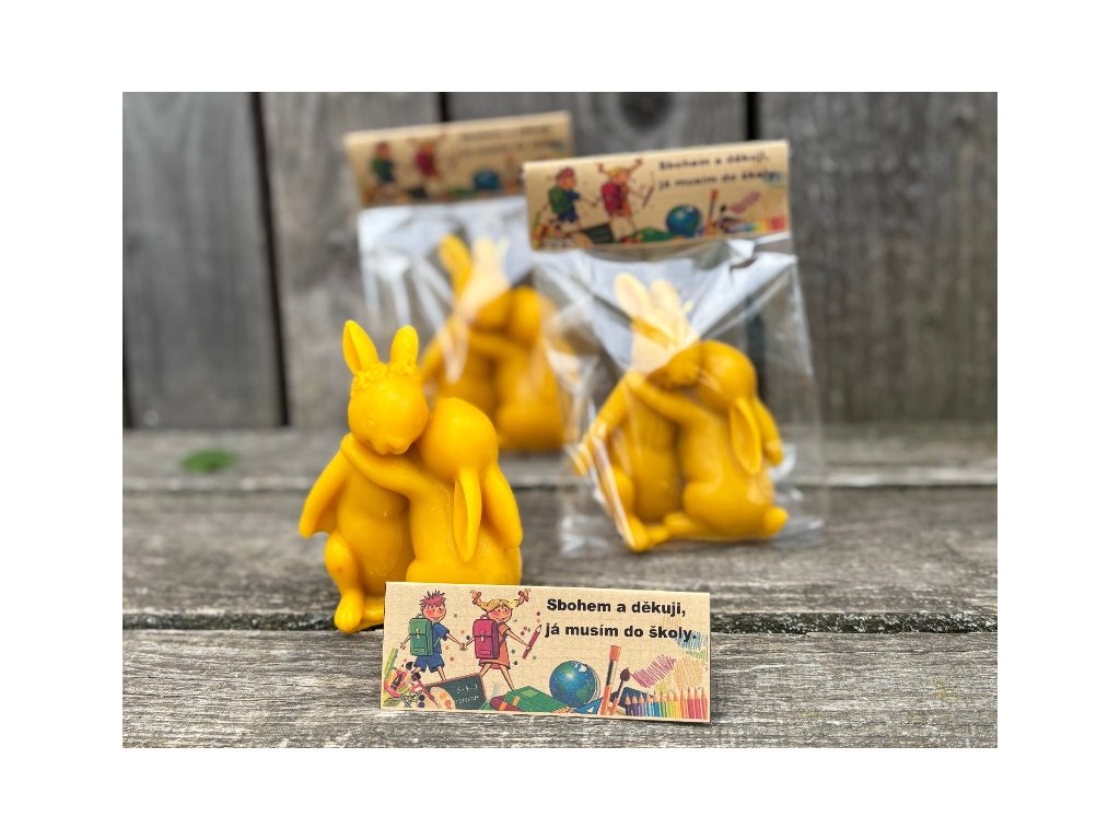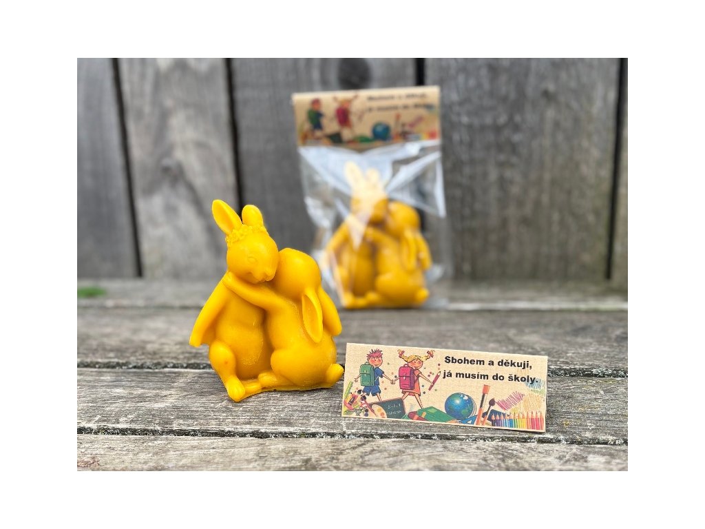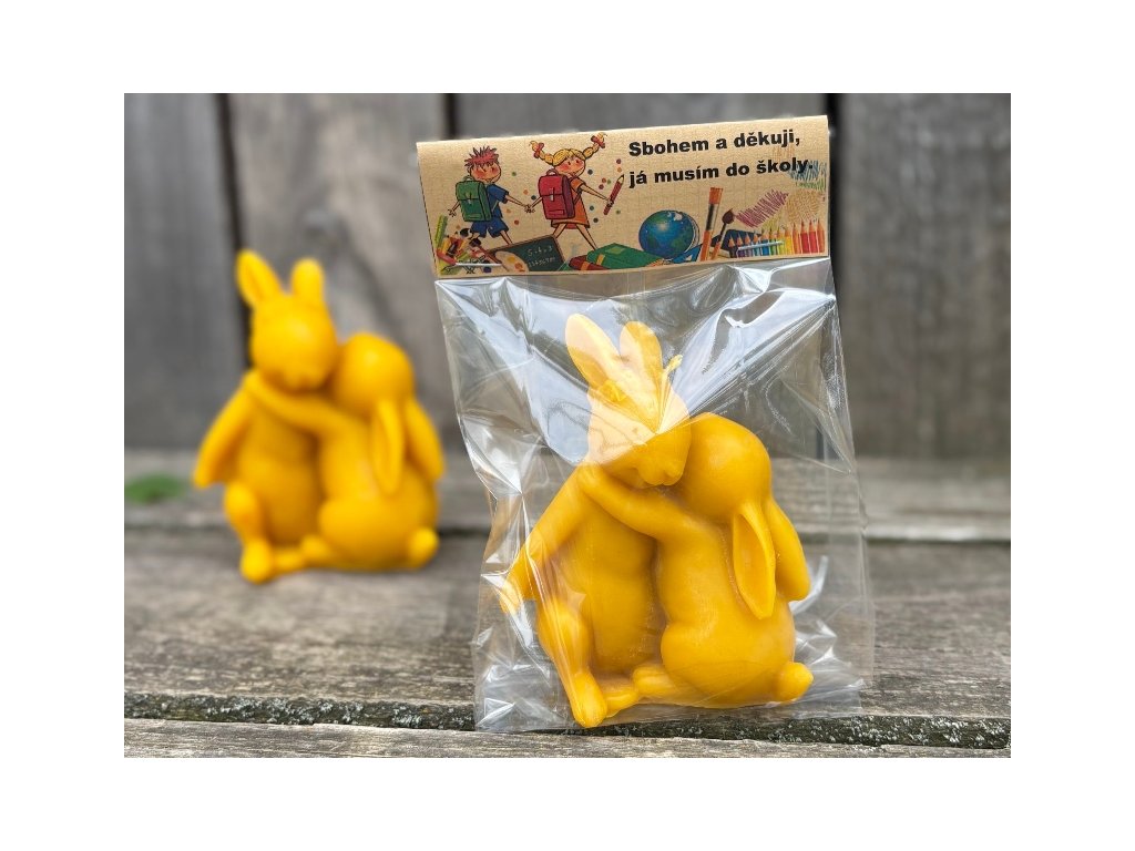 Dárek speciálně navržený pro malé předškoláky, pro ty co se zkrátka po prázdninách už do školky nevrátí. Milá, něžná a krásně propracovaná svíčka z včelího vosku představující dva objímající se zajíčky. Dítě loučící se s paní učitelkou, která ho provázela po celou školkovou docházku, nebo paní kuchařku, co ho krmila na klíně:-). Originální, přírodní dárek z lásky na rozloučenou, který jinde nenajdete. Svíčka je zabalena v celofánovém sáčku a opatřena textem. Velikost svíčky je 11 x 8cm.