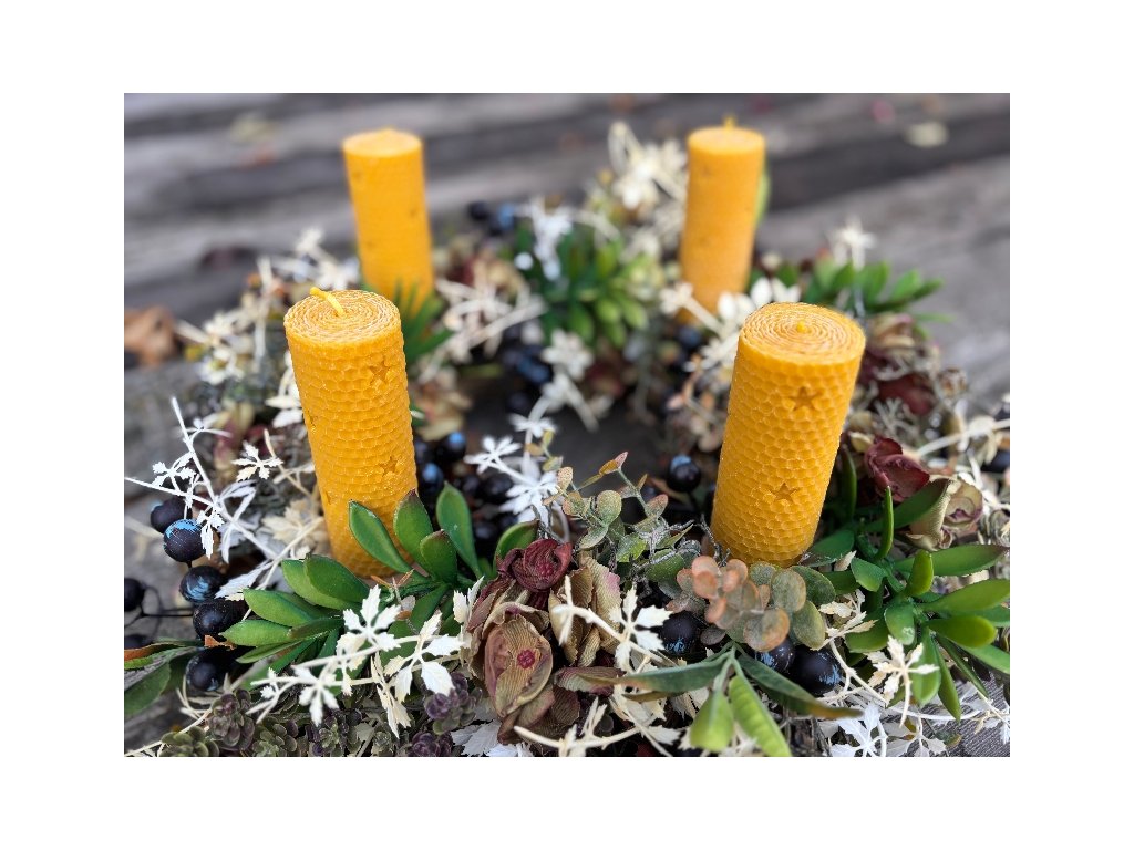 Překrásná svíce stáčená z včelího vosku v přírodní barvě, opatřená výřezy hvězdiček. Ideální jako malý vánoční dárek a naprosto dokonalá na adventním věnci! Krásná přírodní dekorace vašeho vánočního aranžmá. Při hoření vosk uvolňuje příjemnou vůni, který vám provoní celý byt. Svíčka je 4 cm široká a 12 cm vysoká.