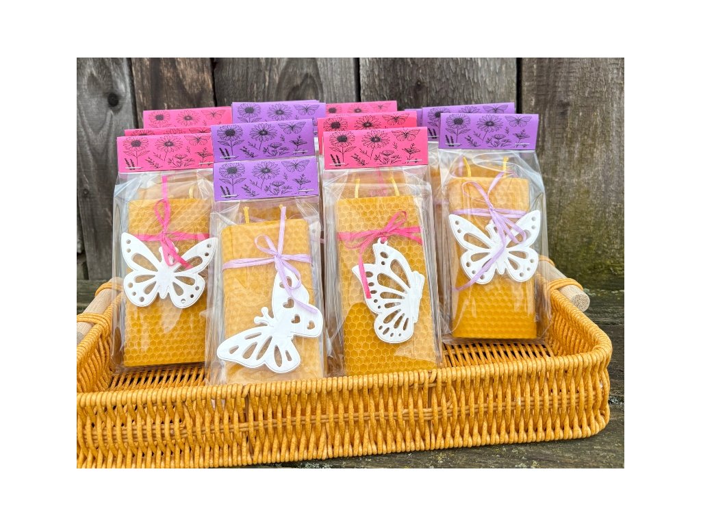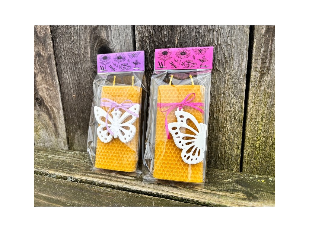 Svíčka stáčená z plátů včelího vosku v přírodní barvě do neobvyklého tvaru o velikosti 12x6x2 cm, přizdobená velmi hezkým a detailně propracovaným keramickým odlitkem motýla. Tuto svíčku můžete darovat nejen k svátku, narozeninám, MDŽ nebo ke dni matek, skvěle se hodí i na konec školního roku jako dárek pro paní učitelky. Milý přírodní dárek od srdce udělá radost vždy. Svíčka je dodávána v celofánovém sáčku, a tak je připravena k okamžitému předání.