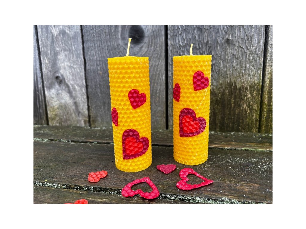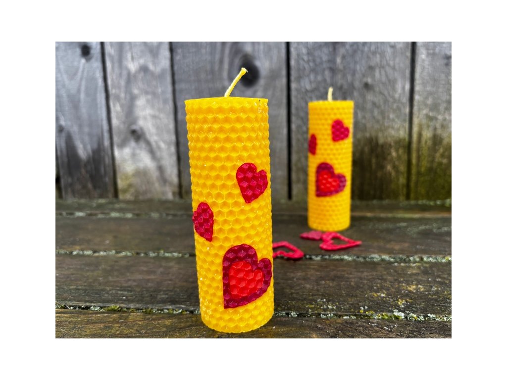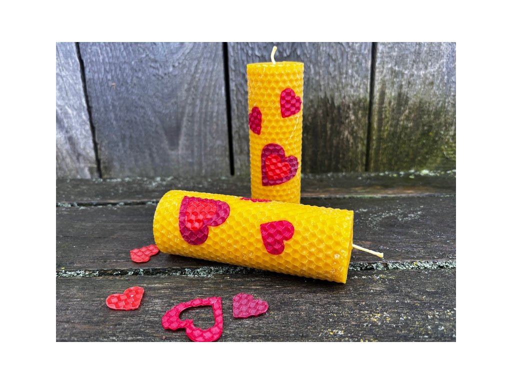 Překrásná barevně vyladěná svíce stáčená z včelího vosku v přírodní barvě, opatřená výřezy srdíček v červených odstínech. Ideální jako malý dárek pro někoho, na kom vám skutečně záleží! Ideální je samozřejmě pro zamilované, ale radost určitě udělá i mamince nebo babičce. Stejně tak ji můžete věnovat jako poděkování! Tato svíčka z přírodních materiálů udělá radost naprosto každému. Svíčka je 4 cm široká a 12 cm vysoká.