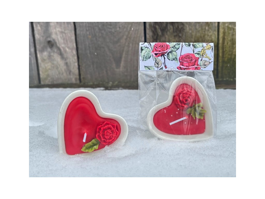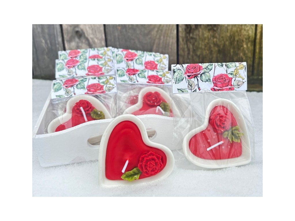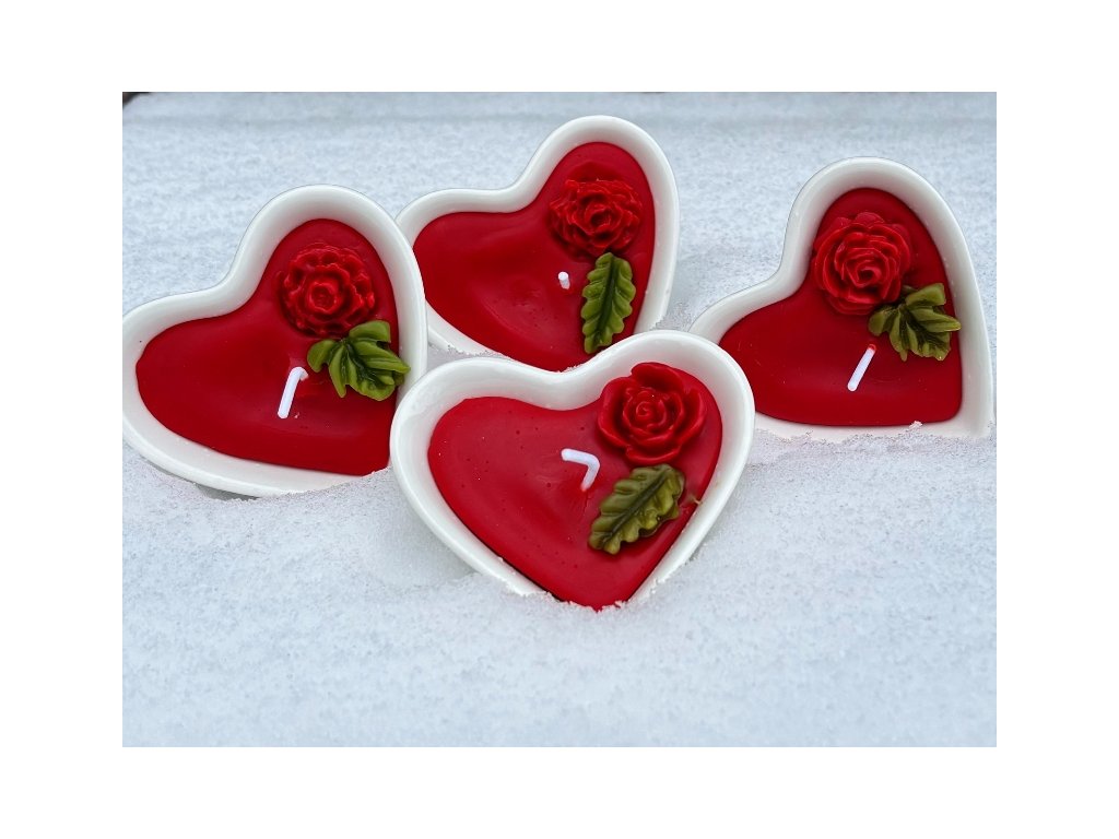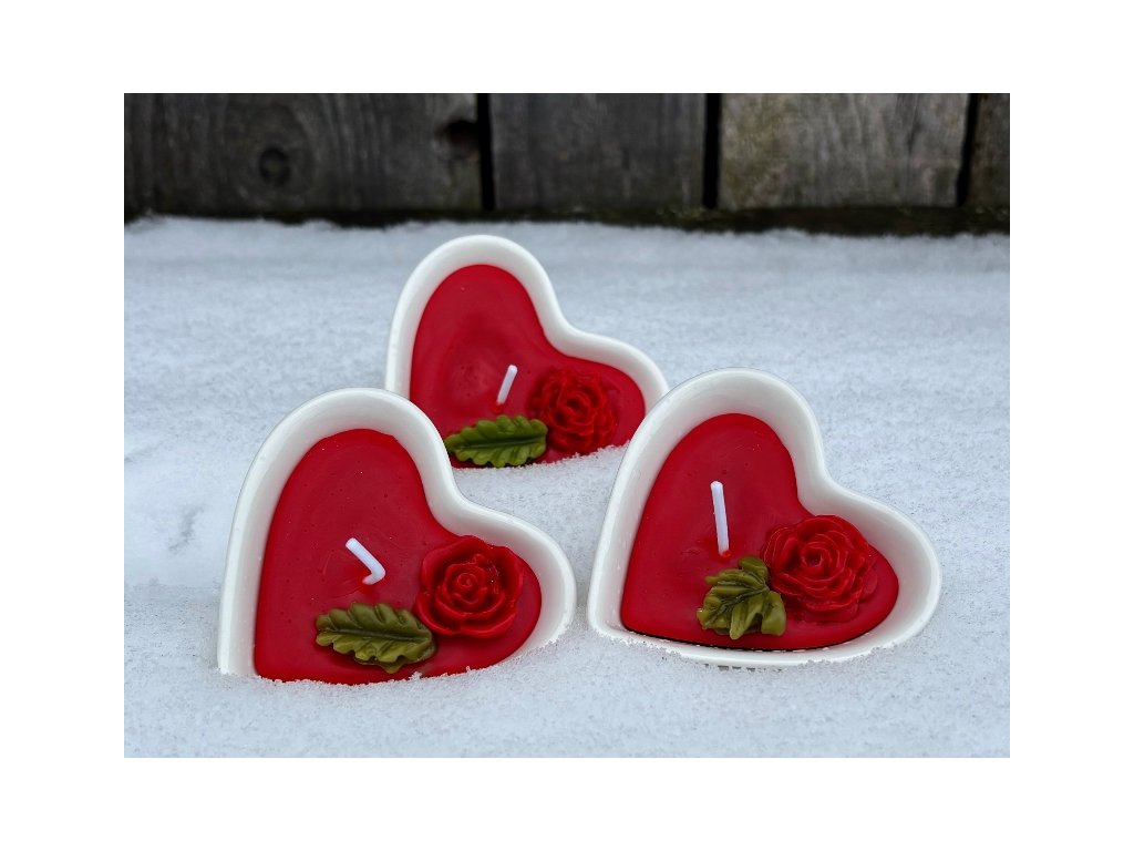 Krásná keramická miska ve tvaru srdce a v ní svíčka z včelího vosku dobarveného do červena. Vlitý vosk je ještě navíc přizdoben odlitky růže a lístků, opět z pravého včelího vosku. Velikost misky je 7,5 x 7cm. Ideálně se tento dárek hodí k Valentýnu, Dni matek, nebo pro paní učitelky na konec školního roku, ale darovat ho samozřejmě můžete kdykoliv během roku. Toto srdíčko nejen že krásně hoří a díky včelímu vosku uvolňuje příjemnou medovou vůni, ale skvěle vypadá i jako dekorace!
