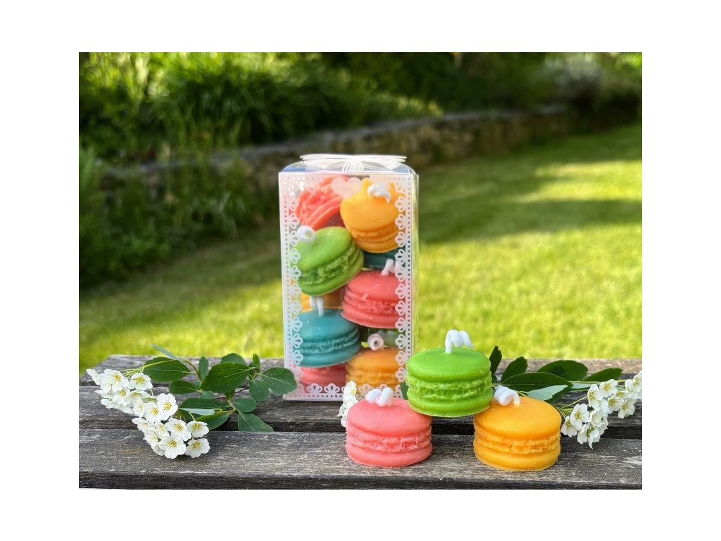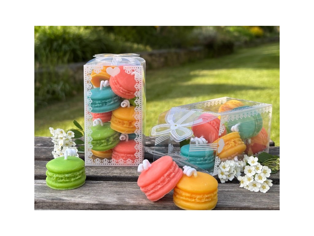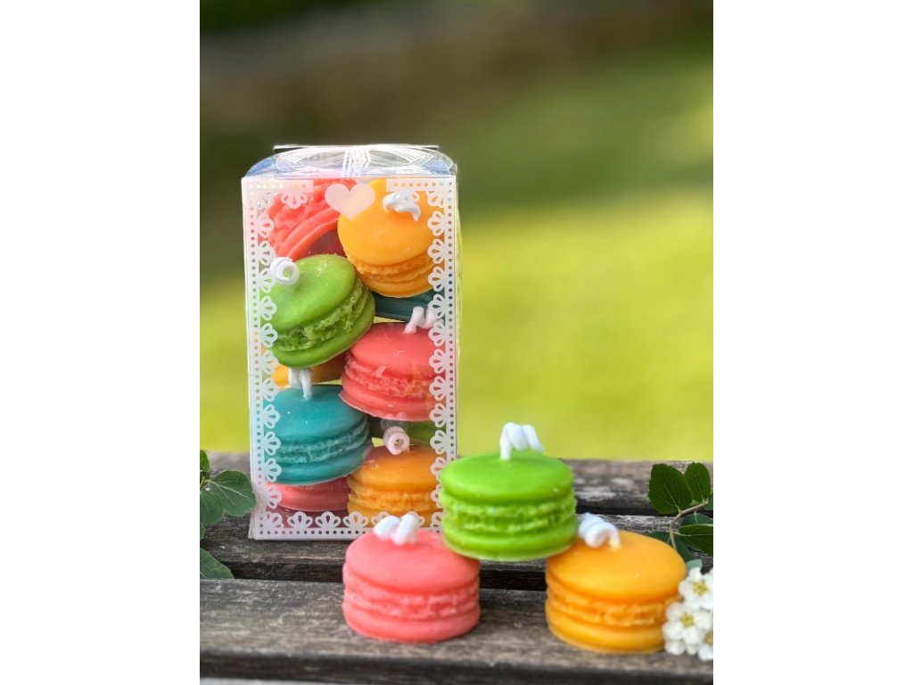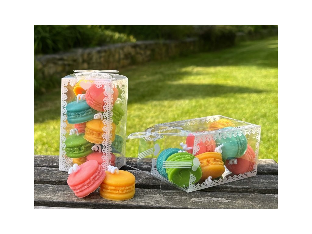 Svíčky ve tvaru makronek (10ks)odlité ze sójového vosku v překrásných barevných odstínech, které přímo lákají k nakousnutí v krásné průhledné krabičce s krajkovým potiskem. Velikost krabičky je 6x6x10,5 cm. Velmi pěkný a milý dárek, který se báječně hodí i jako drobná pozornost prakticky pro kohokoliv a pro jakoukoliv příležitost. Malá bonboniéra bez kalorií. Zkrátka pozornost, kterou musíte mít doma v záloze pro každý případ:-) Člověk nikdy neví, kdy se bude hodit.