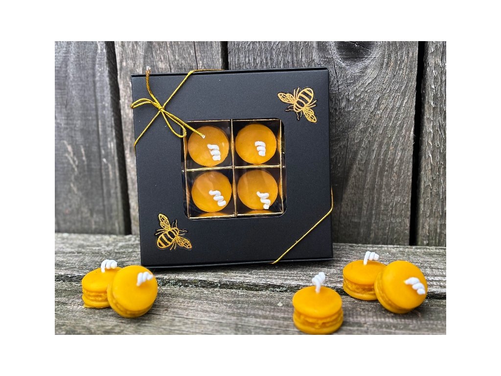 Svíčky ve tvaru makronek (16ks)odlité z pravého včelího vosku s ozdobně zatočeným knotem v luxusní černozlaté dárkové krabičce. Nevšední, nádherný přírodní dárek, který prostě nemá chybu! S touto bonboniérou nedarujete žádný cukr ani kalorie, zato ale spoustu romantiky! Svíčky z včelího vosku nejenže vytvářejí romantickou atmosféru, ale při hoření navíc uvolňují nádhernou medovou vůni. Krabička je přizdobena zlatými včelkami a převázána zlatou nitkou. Dokonale vymazlený dárek!