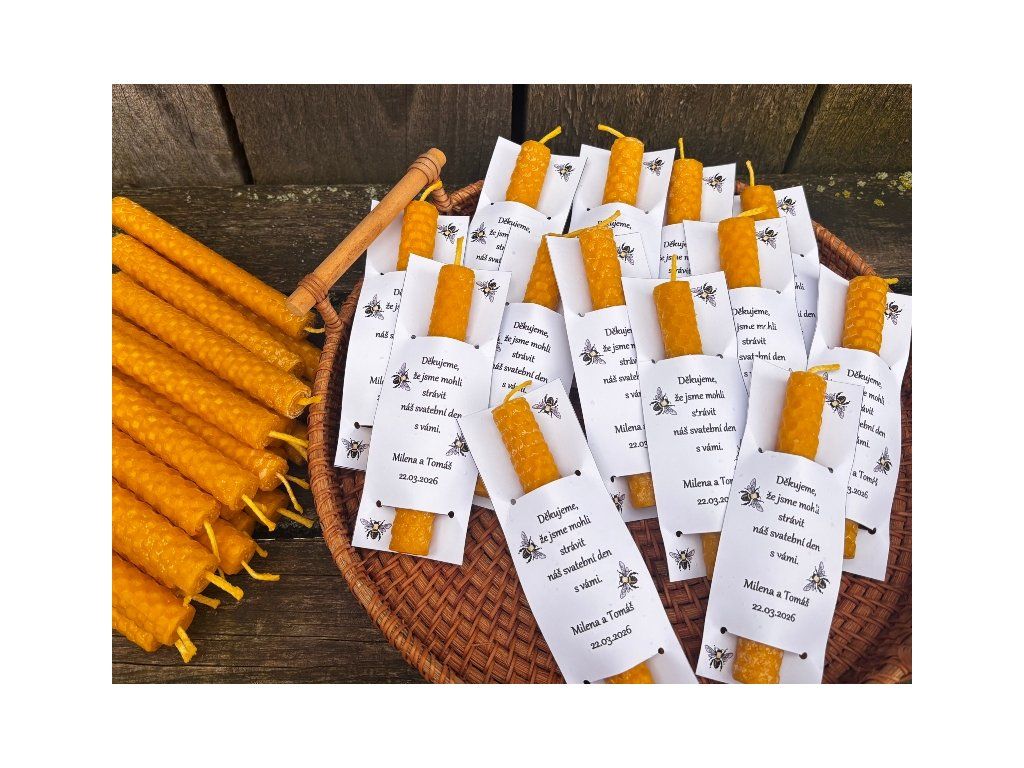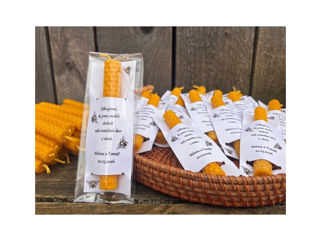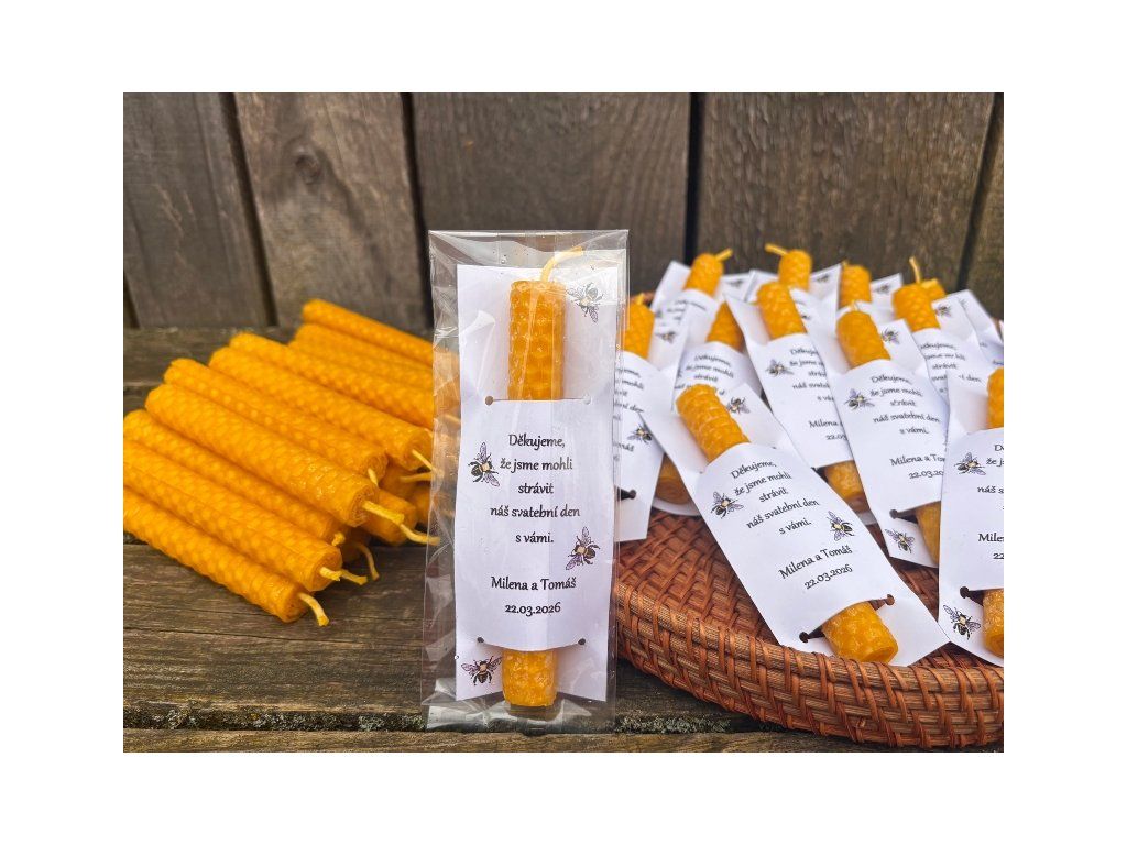 Svíčka stáčená z plátů včelího vosku v přírodní barvě vysoká 12,5cm o průměru 1,5cm vložená ve svatebním přání s textem. Standartně dodáváme tento produkt bez obalu, ale na přání můžeme zabalit do celofánového sáčku, jak je patrné i z fotografií produktu. Do poznámky k objednávce, nebo klidně i mailem prosím uveďte jména snoubenců a datum svatby. Tento produkt je velmi milou pozorností a poděkováním všem, kdo s vámi budou trávit svatební den a jistě potěší a udělá velikou radost!