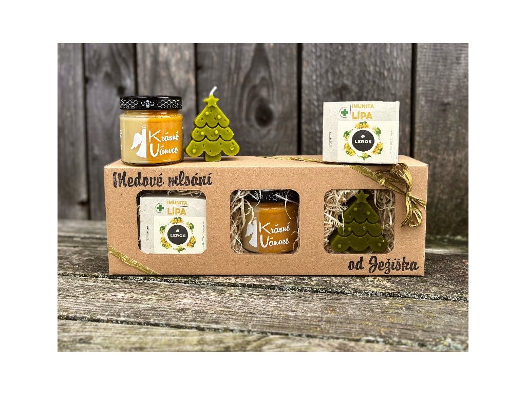 250g dvojbarevného medu s rakytníkem, bylinný lipový čaj od firmy LEROS a svíčka odlitá z pravého včelího vosku dobarveného do zelena ve tvaru vánočního stromečku.