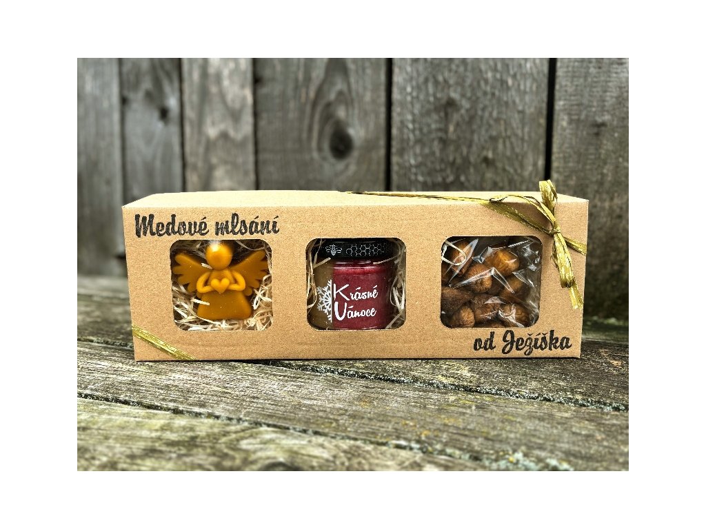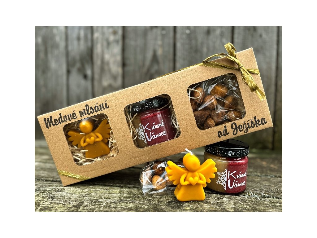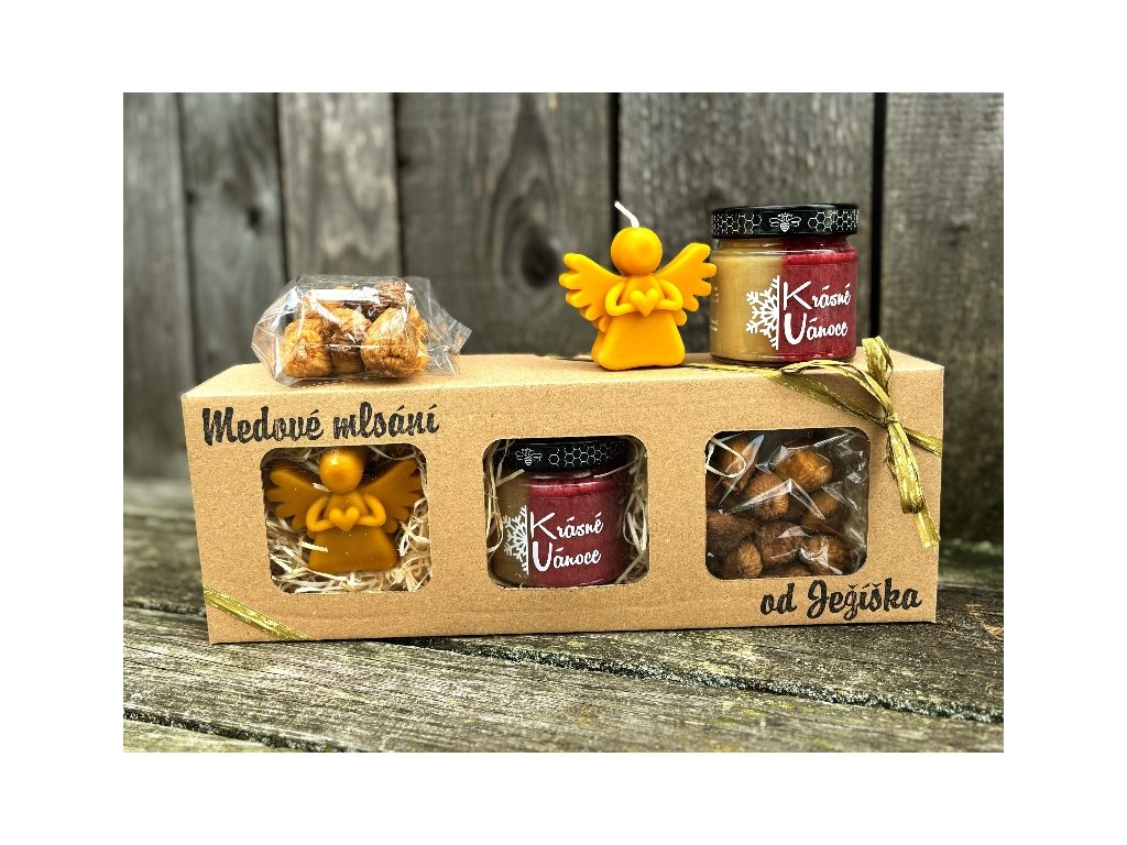 250g dvojbarevného medu s malinami, 100g sušených fíků a svíčka odlitá z pravého včelího vosku ve tvaru andílka.