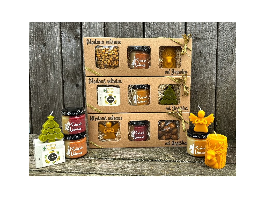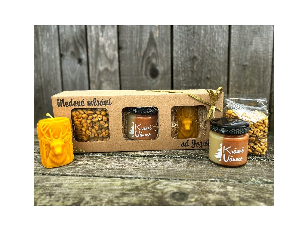 250g dvojbarevného medu s chilli, 100g kukuřice pražené na medu a hořčici a svíčka odlitá z pravého včelího vosku ve tvaru válce s dekorem jelena.