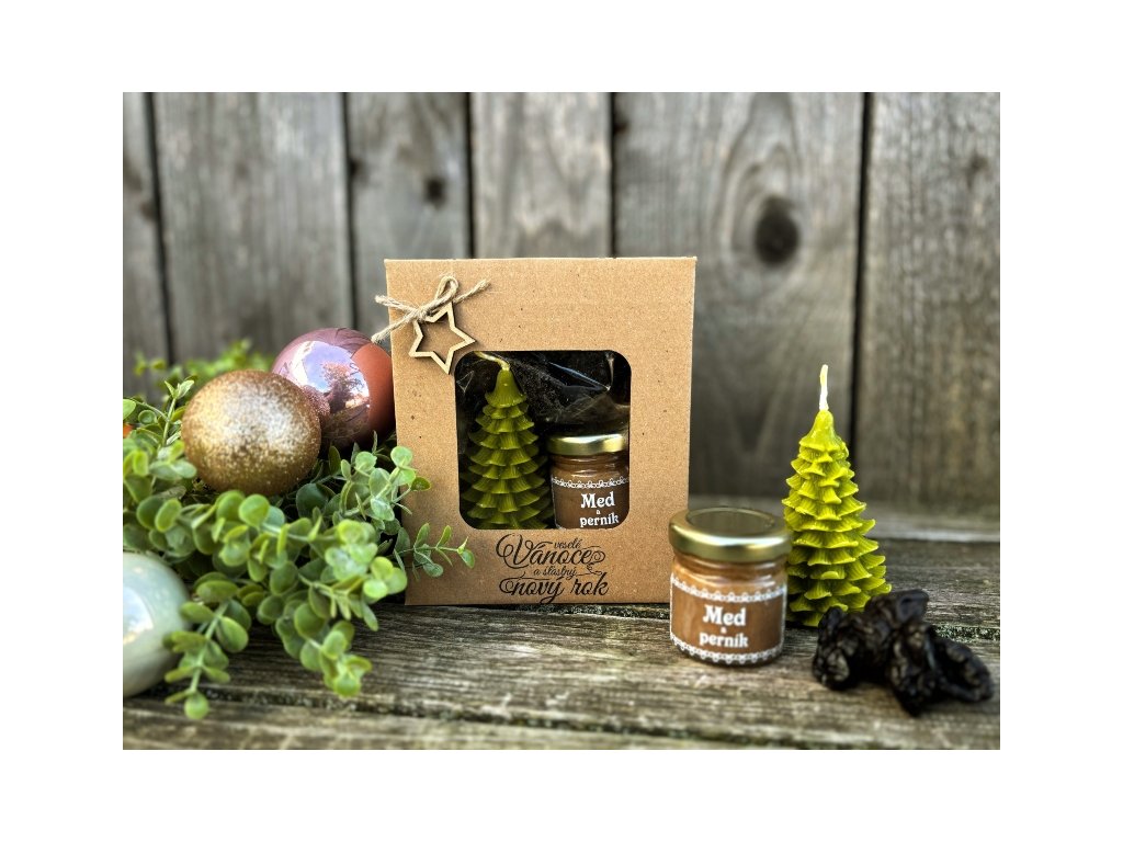 Dárek plný chutí a vůní, které neodmyslitelně k Vánocům patří. Kvalitní kartonová krabička přizdobená textem a milou, dřevěnou dekorací hvězdičky obsahuje 50g květového pastovaného medu s perníkovým kořením + 100g skvělých sušených švestek + svíčku smrčku odlitou z pravého včelího vosku dobarveného do zelené barvy. Kombinace, která všem dokreslí kouzlo dokonalých Vánoc