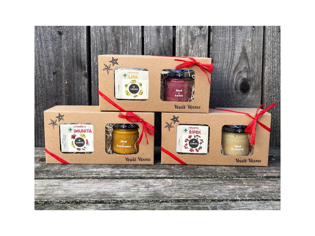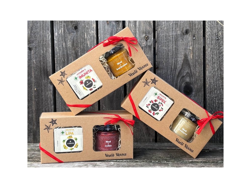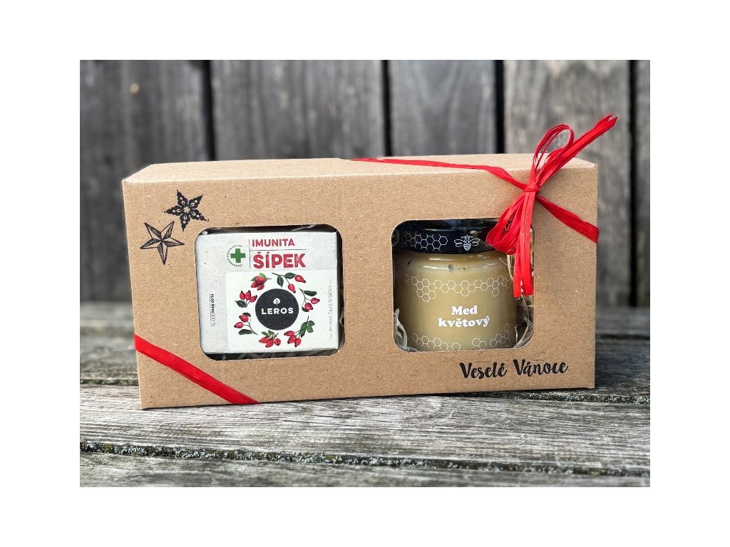 Včelí med a čaj patří ke klasické kombinaci dvou produktů, které se navzájem báječně doplňují. Nabízíme v několika variantách, stačí si jen vybrat. Kvalitní kartonová krabice opatřená vánočním potiskem obsahuje vždy 250g medu od nás z Vysočiny a balený bylinný čaj od skvělé české firmy LEROS. Klasika co nikdy neomrzí a potěší naprosto každého. S tímto dárkem předáte nejen něco velmi chutného a voňavého! S tímto dárkem darujete i velkou porci zdraví prospěšných pochoutek!