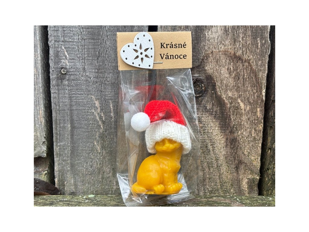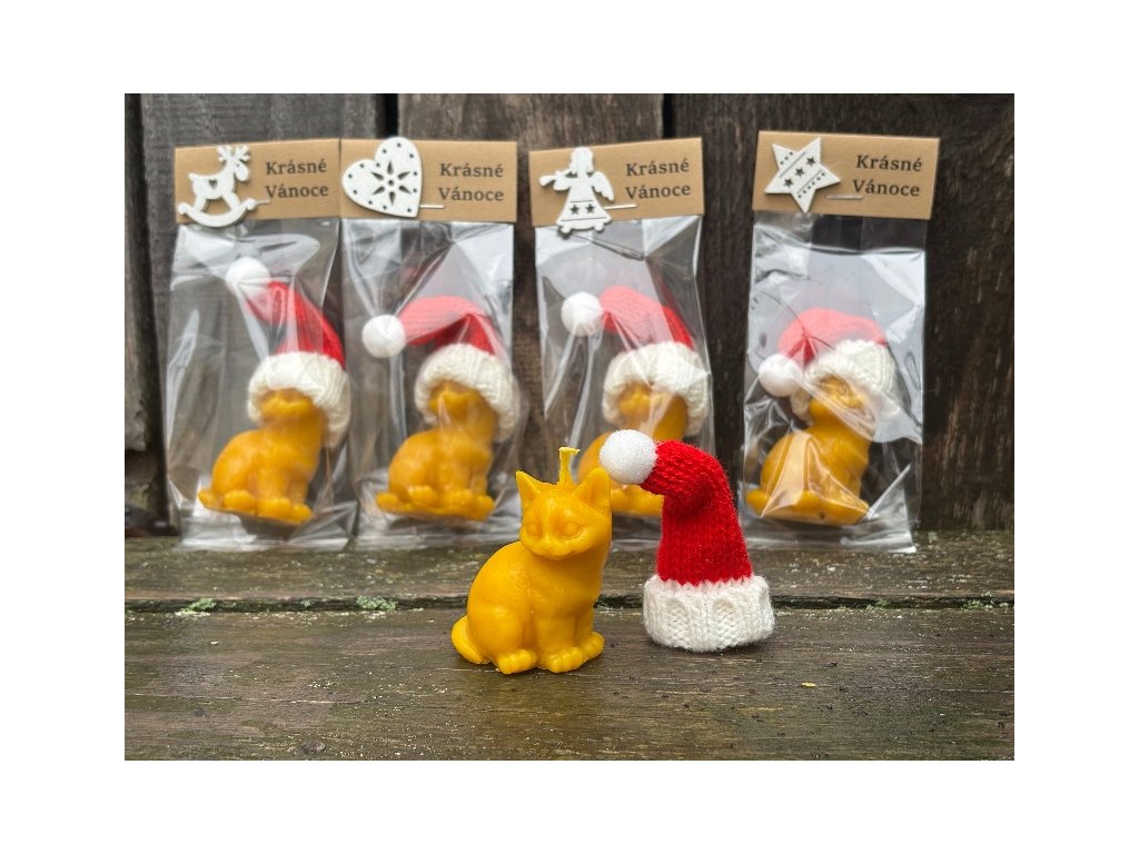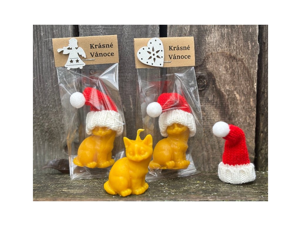 Vtipná pozornost pro vánoční období. Kočičí svíčka o velikosti 6x4cm odlitá z pravého včelího vosku s vánoční čepicí, uložená v celofánovém sáčku a opatřená štítkem s přáním krásných Vánoc. Malý, voňavý a milý vánoční dáreček prakticky pro každého. Ať už ho darujete kamarádce, kadeřnici, kolegyni, nebo ho přinesou vaše děti svým kamarádům do školy, nebo paní učitelce...všem udělá tento vtipný vánoční dáreček velikou radost